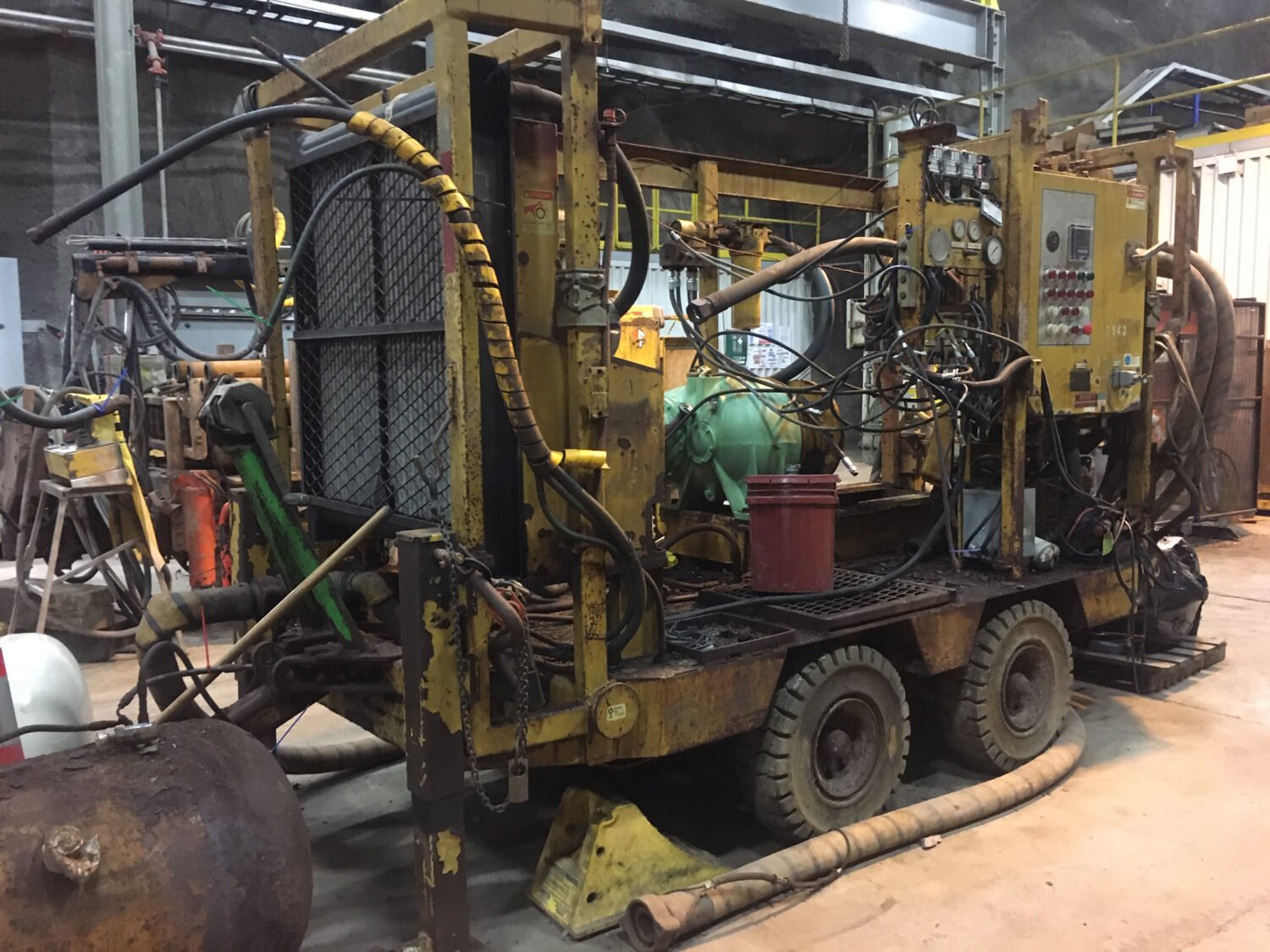Electric-driven compressed air booster packages can be found next to any air-powered drill requiring an elevated compressed air pressure (typically 250-350 psig). The booster takes compressed air from the mine’s standard supply and boosts the pressure as high as 400 psig. These compressors are typically mounted on a towable wheelbase with all the accessories, controls, and fire suppression, so it can be easily moved around with the drills as required.
