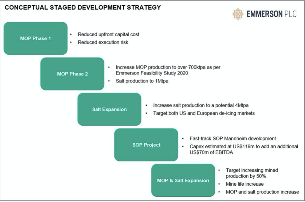 Emmerson Plc, the Moroccan-focused potash development company, is pleased to announce that it is in the process of assessing a conceptual, staged, development for its 100 per cent owned Khemisset Potash Project, aimed at reducing upfront capital costs and incorporating expansion options into the development plan of the project. Emmerson recently received the Mining Licence (see RNS dated 9 February 2021) for Khemisset providing the company with the exclusive right to develop and mine the potash deposit, in the Khemisset basin ahead of the anticipated initiation of construction by the end of 2021.