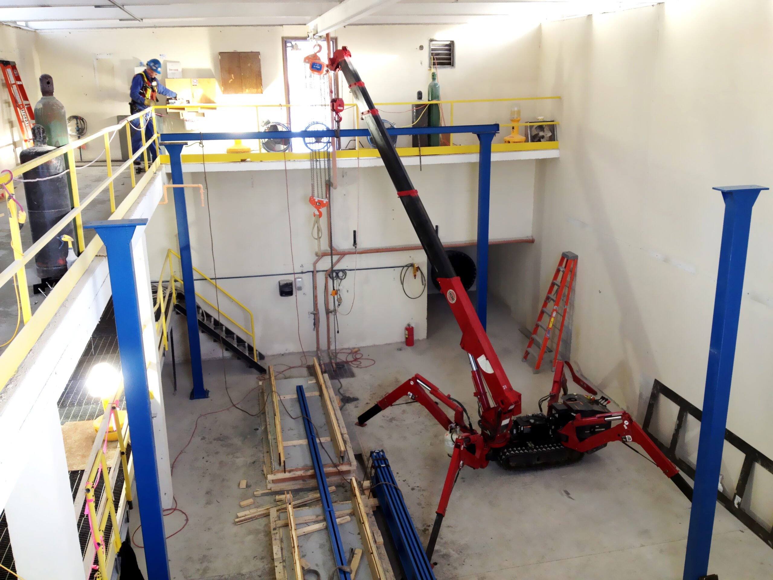 Once the larger components were moved in, the Kristian install team went to work constructing the workstation crane within the little tin can room. They continued using the monorail electric chain hoist to lower components into the room and the spyder crane to hoist them into place.  Once the workstation install was completed and commissioned, the spyder crane was disassembled and hoisted out of the room using the monorail. Finally, the electric chain hoist was removed and voila! The city pump station had a new Gorbel workstation crane to assist them with maintenance and repairs going forward.